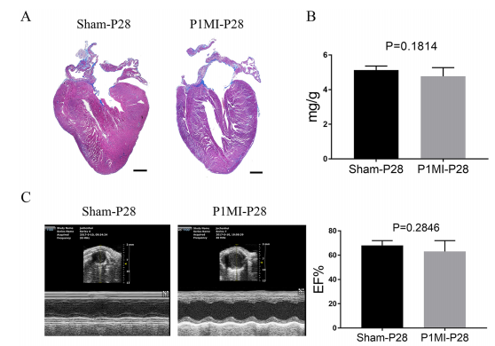 Fig. 4. P1 mice hearts show nearly full regeneration while P7 mice hearts show little regeneration after LAD ligation.(A)Representative images of Masson’s trichrome staining of P28 mice heart after P1 sham-operated or P1 MI. Hearts were longitudinally cut. Scale bar: 0.5 mm. (B)Heart weight to body weight ratio at P28. (C) Representative images of M-mode echocardiography and EF values at P28, n=5 for each group.