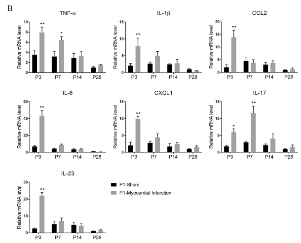 Fig. 5. Time‐course of the acute inflammatory response in mouse hearts after P1 MI. (A) Hematoxylin and eosin (HE) staining of P3, P7, P14 and P28 hearts after P1 MI.Representative images of low and high magnification views are shown. Scale bars, 200 µm. (B) qPCR assays of the expression of inflammatory markers (TNF-α, IL-1β, Ccl2, IL-6, Cxcl1, IL-17 and IL-23) in P3, P7, P14 and P28 heart tissues after P1 MI, n=5 per group, P1-Sham P28 group was set as control, *P<0.05, **P<0.01 compared with P1-Sham group at the same time point.