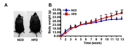 6-8周龄C57BL/6小鼠随机分组,模型组给予高脂饮食(60%kcal HFD)诱导,对照组给予普通饲料喂养,两组小鼠连续喂养8-10周。