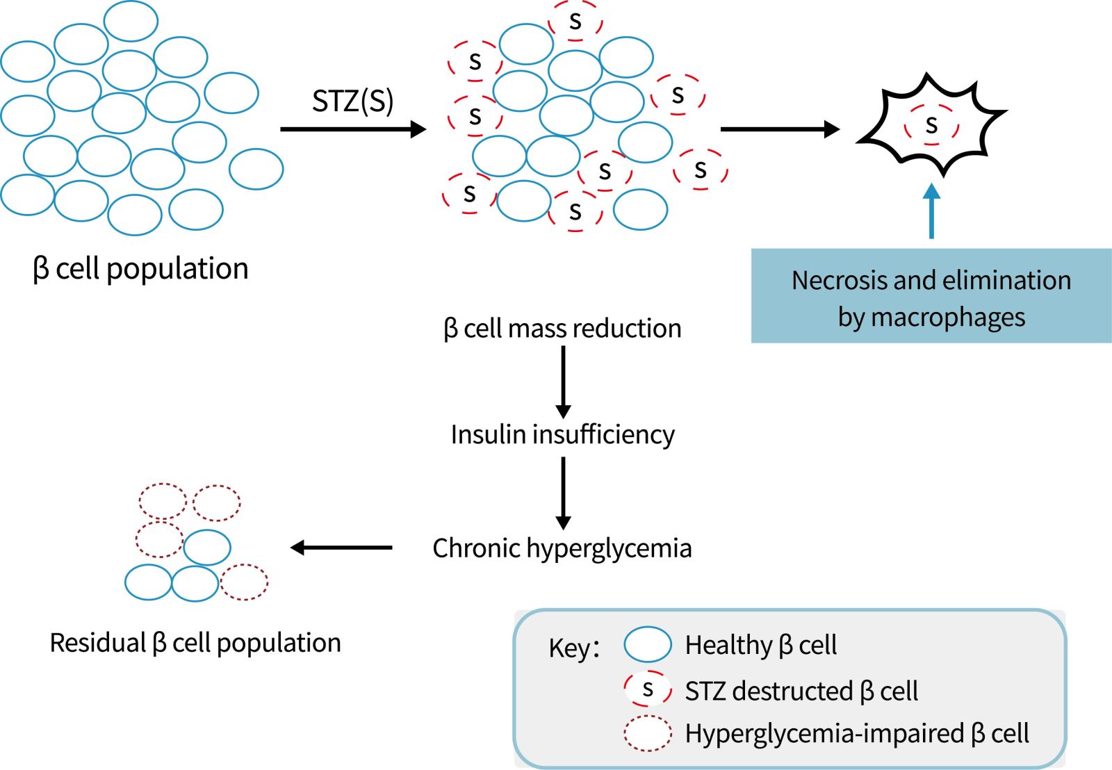 造模机制:链脲佐菌素(Streptozocin,STZ)是一种含亚硝基的化合物,可使胰腺β细胞产生毒素的光谱抗生素,通过葡萄糖转运蛋白2转运到胰腺β细胞中,导致其DNA发生烷基化,生成NO和自由基,破坏细胞,致使β细胞无法分泌胰岛素。