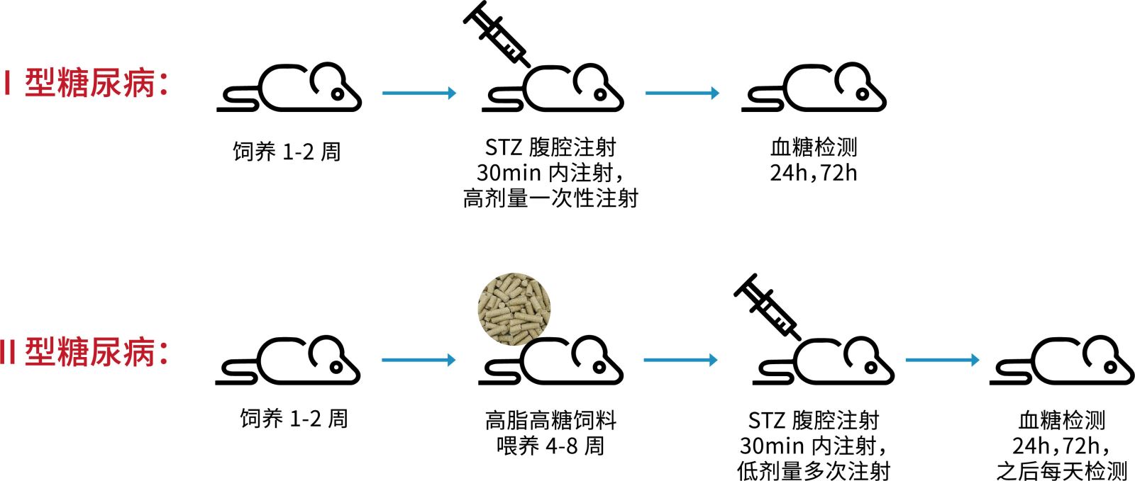 糖尿病主要分为Ⅰ型糖尿病(胰岛素绝对缺乏)和Ⅱ型糖尿病(胰岛素进行性分泌不足或抵抗),不同的诱导剂量、方式可产生不同的糖尿病动物模型。