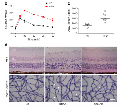Fig .2.(b, c) Curve and AUC for the results of the IPGTT; n=6 experimental samples per group. (d) Representative images of retinal H&E staining and a trypsin digestion assay in HFD/ STZ-induced type 2 diabetic mice.
