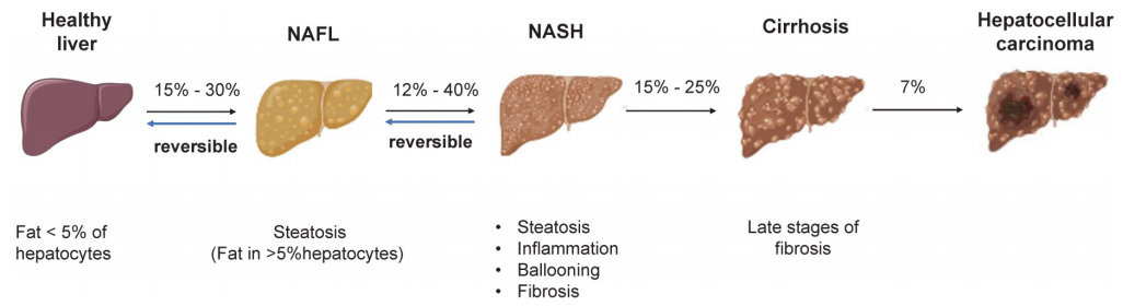 非酒精性脂肪性肝病(NAFLD,Nonalcoholic fatty liver disease)是一种肝脏中储存过多脂肪的疾病。不是饮酒导致的肝脏脂肪堆积时,这种情况称为非酒精性脂肪肝炎(NASH),导致NASH的主要危险因素包括肥胖、II型糖尿病、血脂异常和代谢综合征等。NASH除了肝脏脂肪变性,还包括膨胀、炎症和纤维化。在NASH中后期,炎症和肝细胞损伤可导致肝纤维化或瘢痕形成,可以进一步发展为肝硬化或肝癌。